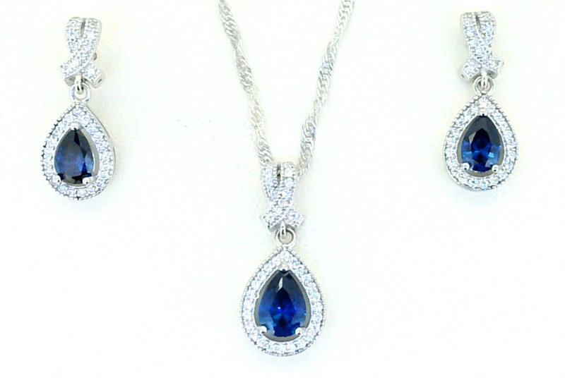 Sim. Blue Stone Pear Shape & Cubic Zirconia Halo Earrings & Pendant with 18″ Chain Sterling Silver