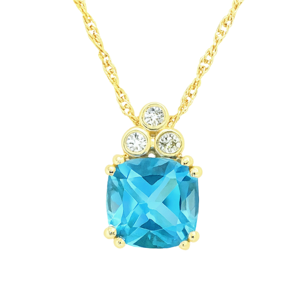 Gen. Blue Topaz Cushion 7mm & .03TCW Diamond Pendant with 18″ Chain 10KT