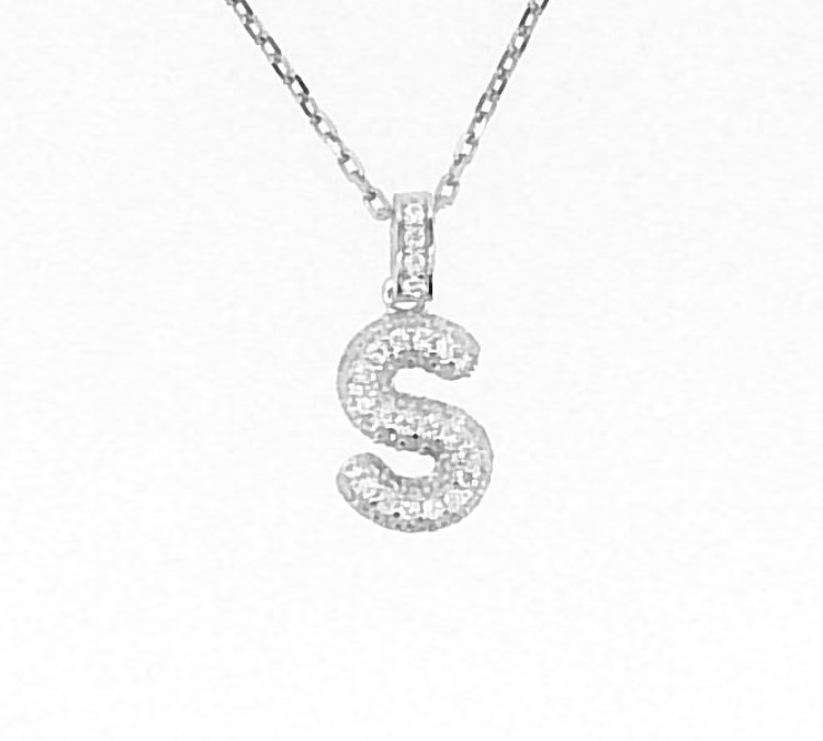 S Initial Cubic Zirconia Pave Pendant with 18″ Chain Sterling Silver/14MM