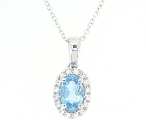 Genuine Blue Topaz Oval 6×4 & Diamond Halo Pendant with Chain 10KT WG