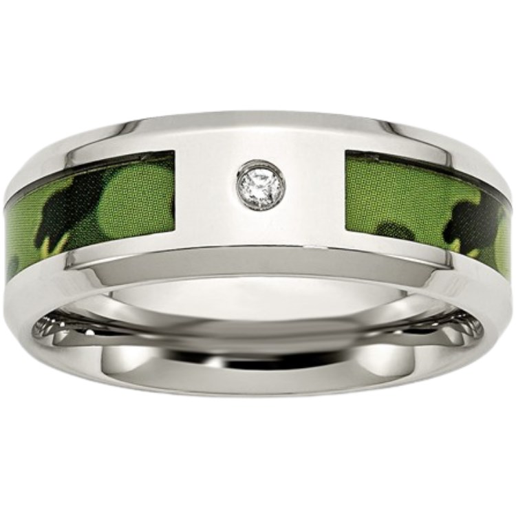 8MM Green Camo with Diamond Stainless Steel Wedding Band/Size 10