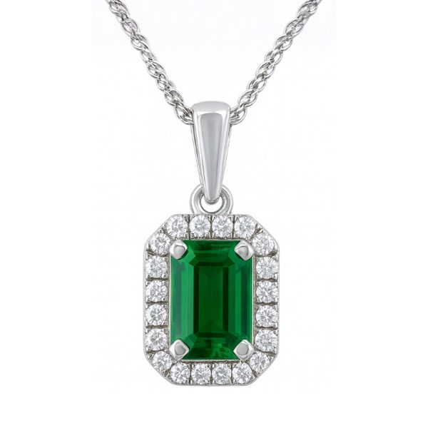 Gen. Emerald 6×4 & .10TCW Diamond Cluster Pendant with 18″ Chain 14KT WG