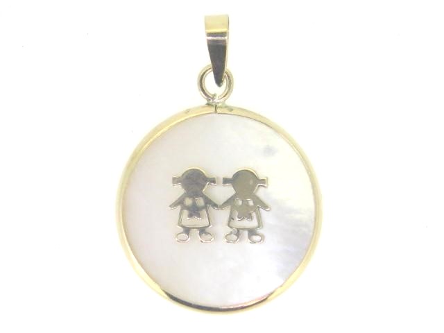 2 Kids Inlay Framed Mother of Pearl Disc Pendant 10KT/18MM *CLEARANCE-FINAL SALE*