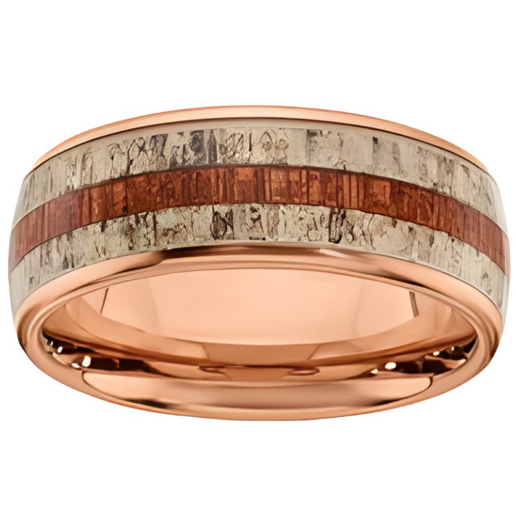 8MM Wood & Antler Inlay Rose Plated Stainless Steel Wedding Band/Size 10