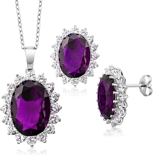 Sim. Amethyst Oval & Cubic Zirconia Cluster Pendant W/Chain & Earring Set Sterling Silver *FINAL SALE*