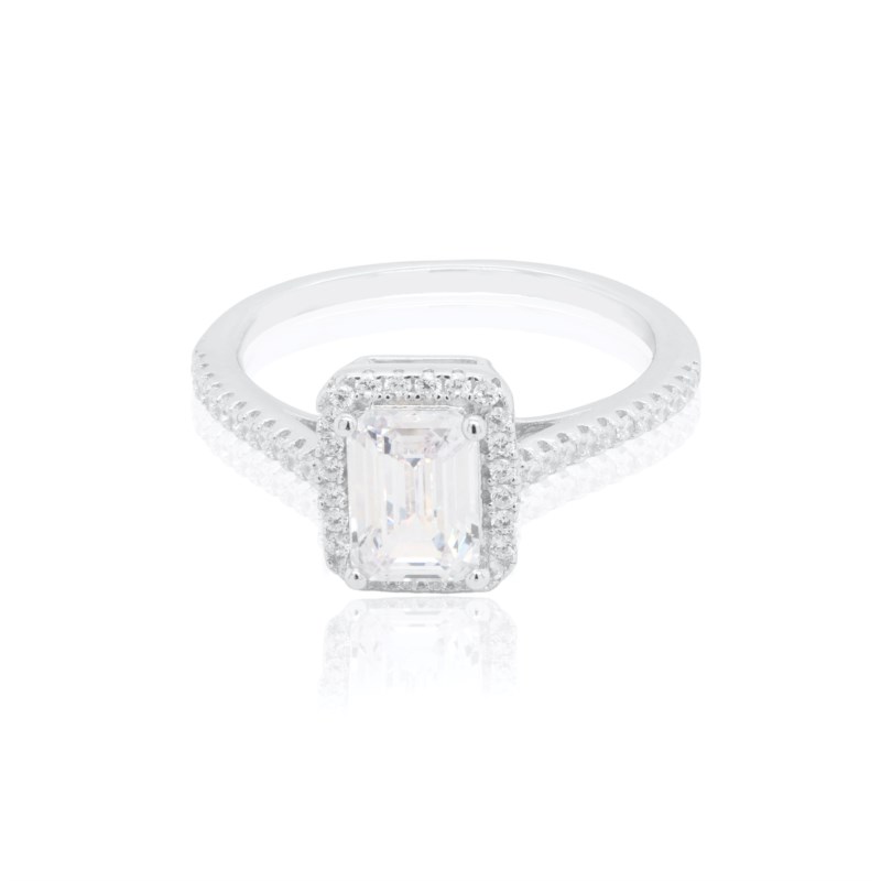 7x5MM Emerald Cut Cubic Zirconia Halo Accented Ladies Ring Sterling Silver/SIZE 7