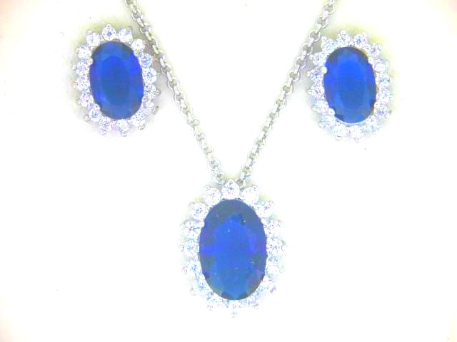 Sim. Sapphire & Cubic Zirconia Halo Pendant W/ Chain & Earring Set Sterling Silver *FINAL SALE**