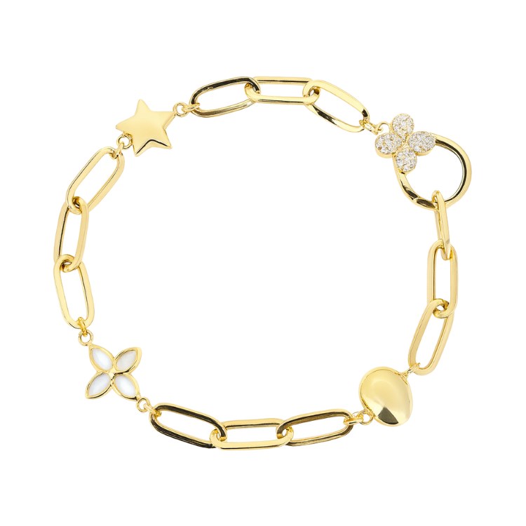 Paper Clip Link with Charms, Mother of Pearl Inlay & Cubic Zirconia with Spring Hinge Charm Clasp 7.75″ Bracelet 10KT/6MM