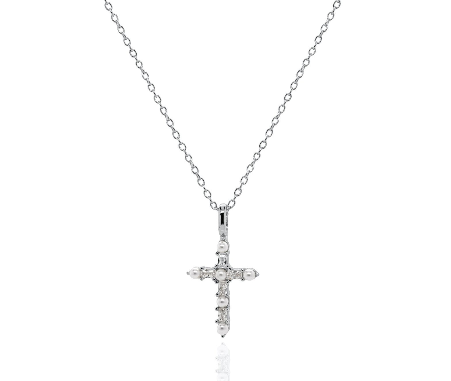 / Fresh Water Pearl & Cubic Zirconia Cross Pendant with 16-18″ Chain Sterling Silver/17MM