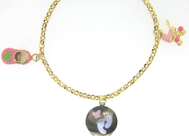 7.5″ Baby Girl Pink Enamel 3 Charm Rolo Link Bracelet 10KT *CLEARANCE-FINAL SALE*
